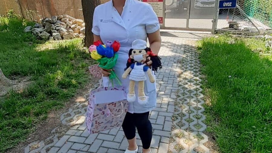 Třída Sluníček se na zpáteční cestě z dopravního hřiště zastavila za jednou milou zdravotní sestřičkou (děti zdravotní sestřičku znají. Je to maminka Davídka, který chodil k nám do školky.). Děti s paními učitelkami poděkovaly za zdravotní péči v koronavirové době a předaly vyrobené dárky.