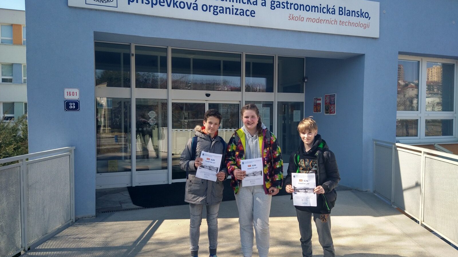 V rámci technicky zaměřených soutěží jsme se v úterý 22. března dostavili s vybranými žáky – jmenovitě s Karolínou Juračkovou, Jakubem Truhlářem a Stanislavem Vahalou – do prostor SŠ TEGA Blansko na již tradiční Technickou olympiádu pro žáky 6. a 7. ročníků.