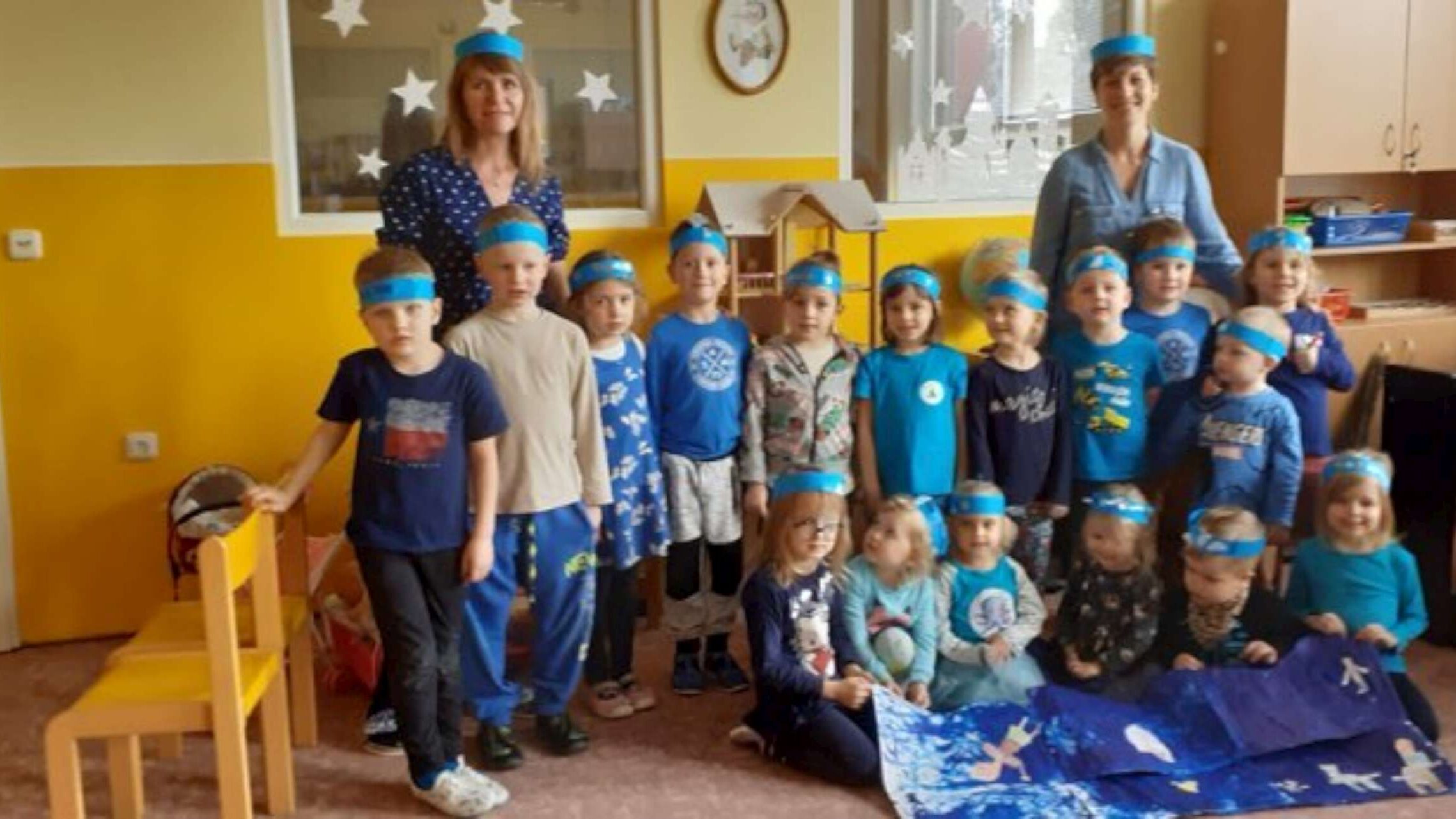 Děti hledaly ve třídě předměty, které jsou modré. Motýlci vyráběli čepice a rukavice pomocí inkoustové techniky a Sluníčka si vyrobily modrou čelenku a potom si společně vytvořily moře. Mladší děti namalovaly pomocí prstů moře a starší nakreslily plavce.