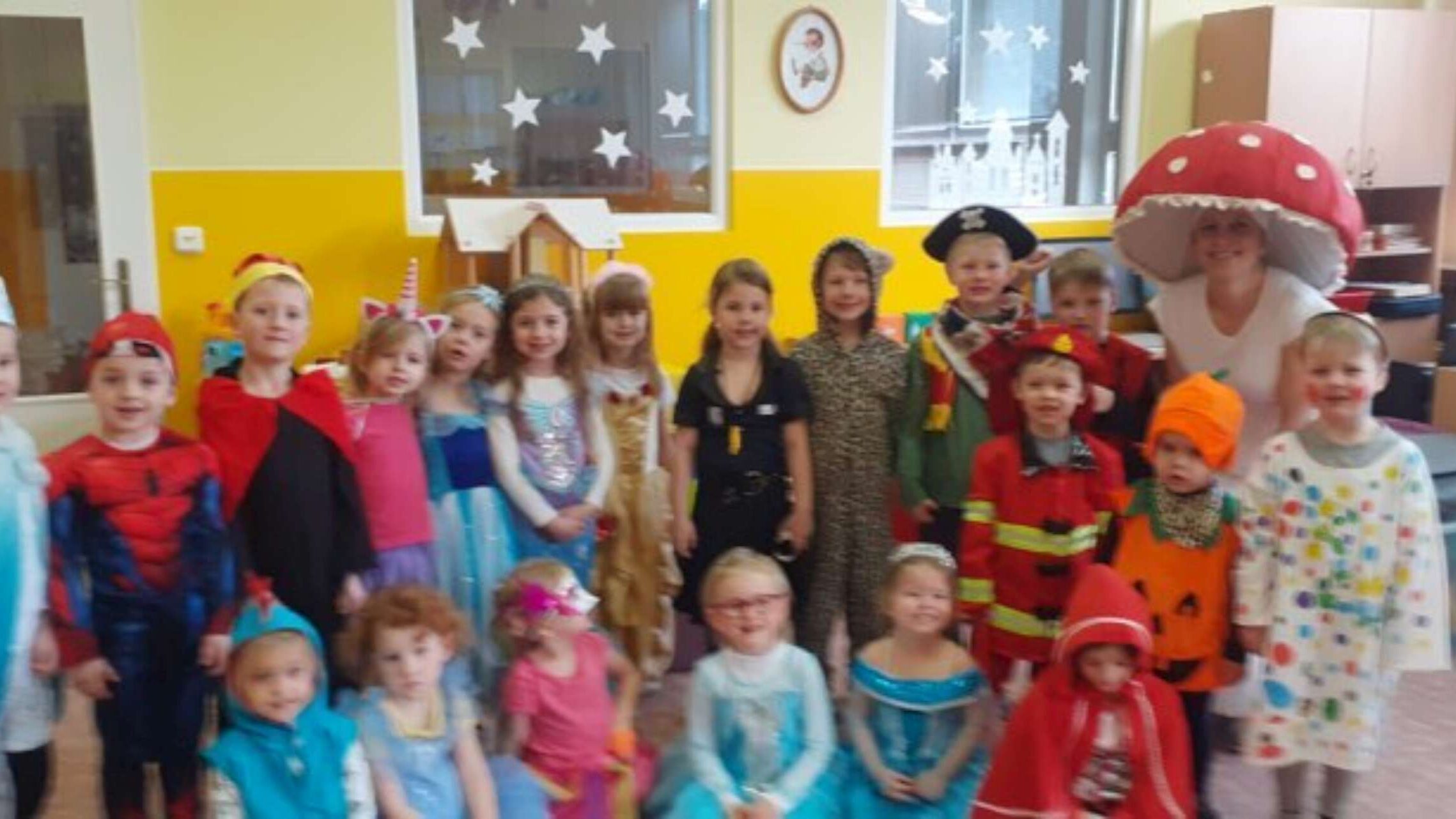 Úno202023Aktuality MŠ Děti převlečené v maskách vyrazily zazpívat masopustní písničky do školy a potom si užily tanec a soutěže.