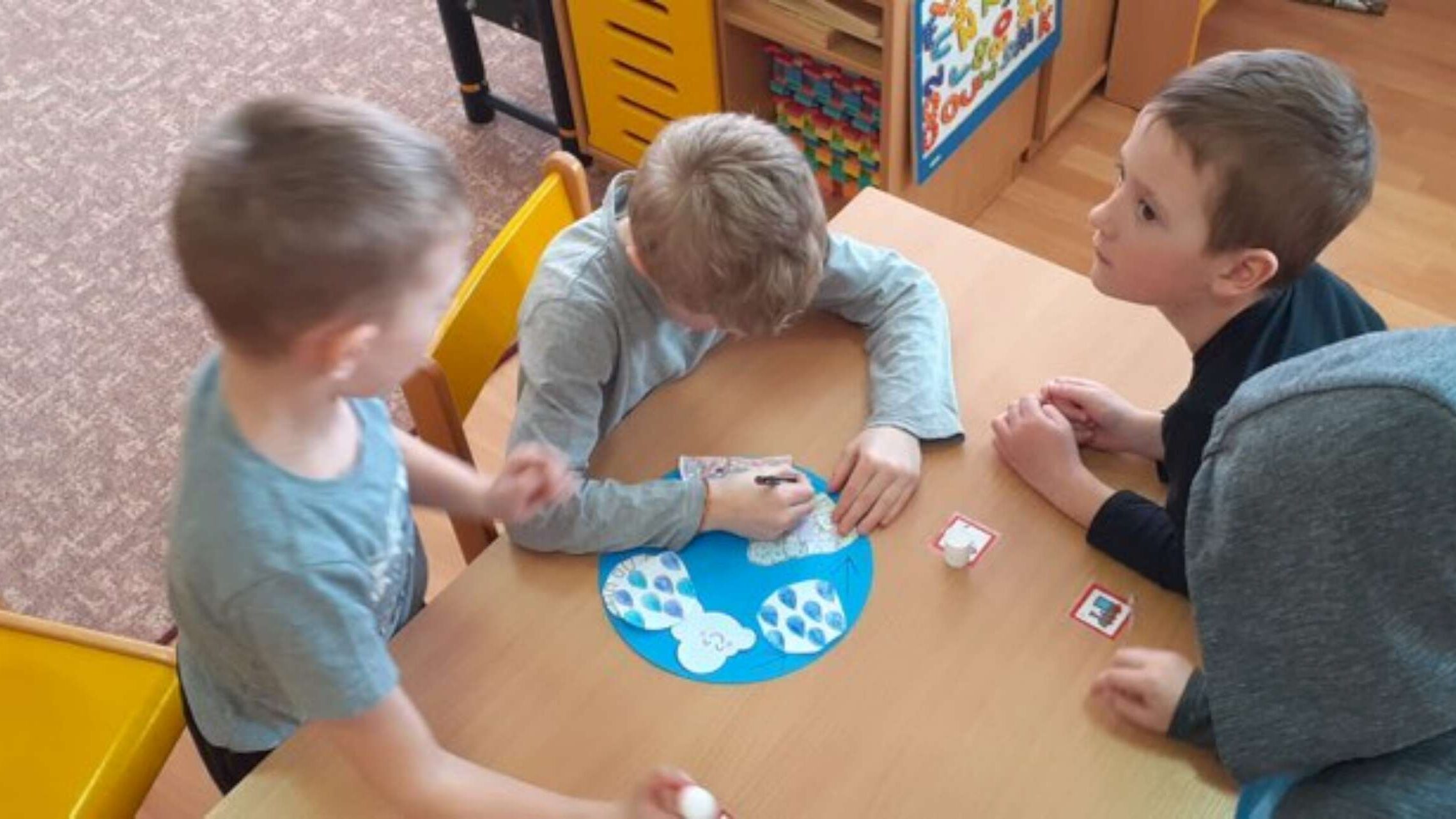 Také ve třídě Sluníček děti zhlédly příběh o koloběhu vody a povídaly si o důležitosti vody. Malé děti vyrobily zapouštěním modré barvy mraky, starší děti vystřihovaly kapky a předškolní děti vyrobily obrázek o koloběhu vody.