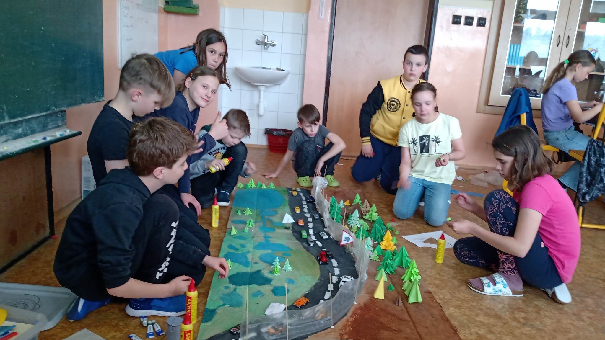 Asi před měsícem si žáci našich pátých ročníků vyslechli, jak lze pomoci našim obojživelníkům v jejich rozmnožovacím tahu. A nějaký ten čas pak ve výtvarných výchovách třída 5. B tvořila trojrozměrný model barikád umísťovaných dobrovolníky z žabí hlídky, kteří pomáhají přenášet žáby a další živočichy přes silnici, aby se vyhnuli smrtícím pneumatikám.