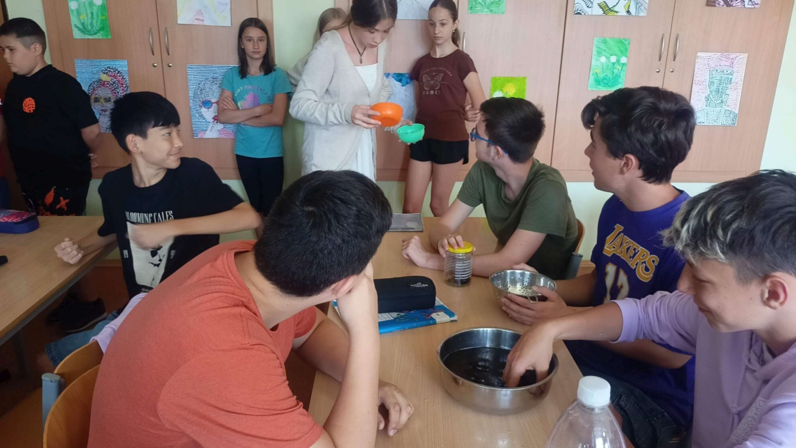 V rámci výuky zeměpisu v devátých ročnících došlo k výměně rolí mezi mnou a mými žáky. Žáci byli rozděleni do skupin a každá skupinka měla za úkol připravit si vyučovací hodinu na jeden z globálních problémů. Aktuálně probírané téma týkající se znečištění a čištění vody se propojovalo i s výukou v šestém ročníku. Proč toho nevyužít? Spojili jsme tedy dvě třídy dohromady. Žáci devátých ročníků si připravili velmi zábavnou a hodně praktickou vyučovací hodinu zaměřenou na čištění vod. Vyzkoušeli si tak vyčistit znečištění pomocí různých sít a filtračního papíru. Věříme, že se žákům hodina líbila a odnesli si z ní nejenom zážitek, ale i znalosti.