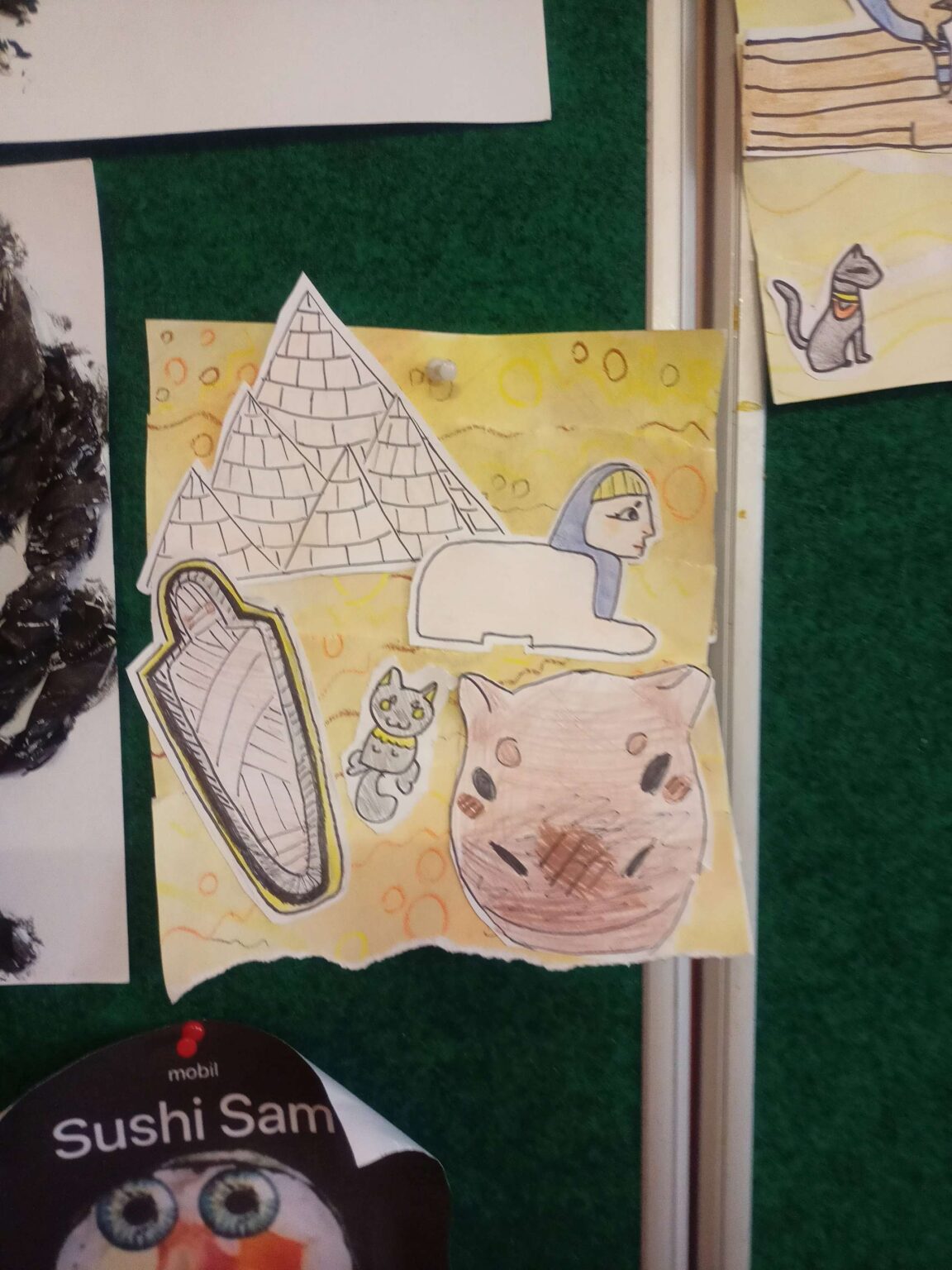 Na začátku jsme si s dětmi v krátkosti představili Egypt – jeho kulturu a typické symboly, jako jsou pyramidy, sfingy, velbloudi nebo kočky. Tím jsme navodili atmosféru, která inspirovala jejich tvorbu.