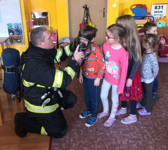 Pan Hanousek nás seznámil s prací profesionálního hasiče, společně jsme ho oblékli do zásahového oblečení a výbavy k ohni.