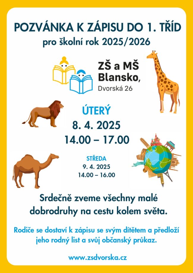 Ředitel Základní školy a Mateřské školy Blansko, Dvorská 26, vyhlašuje zápis dětí k základnímu vzdělávání pro školní rok 2025/2026 – organizace a průběh zápisu s názvem Cesta kolem světa.