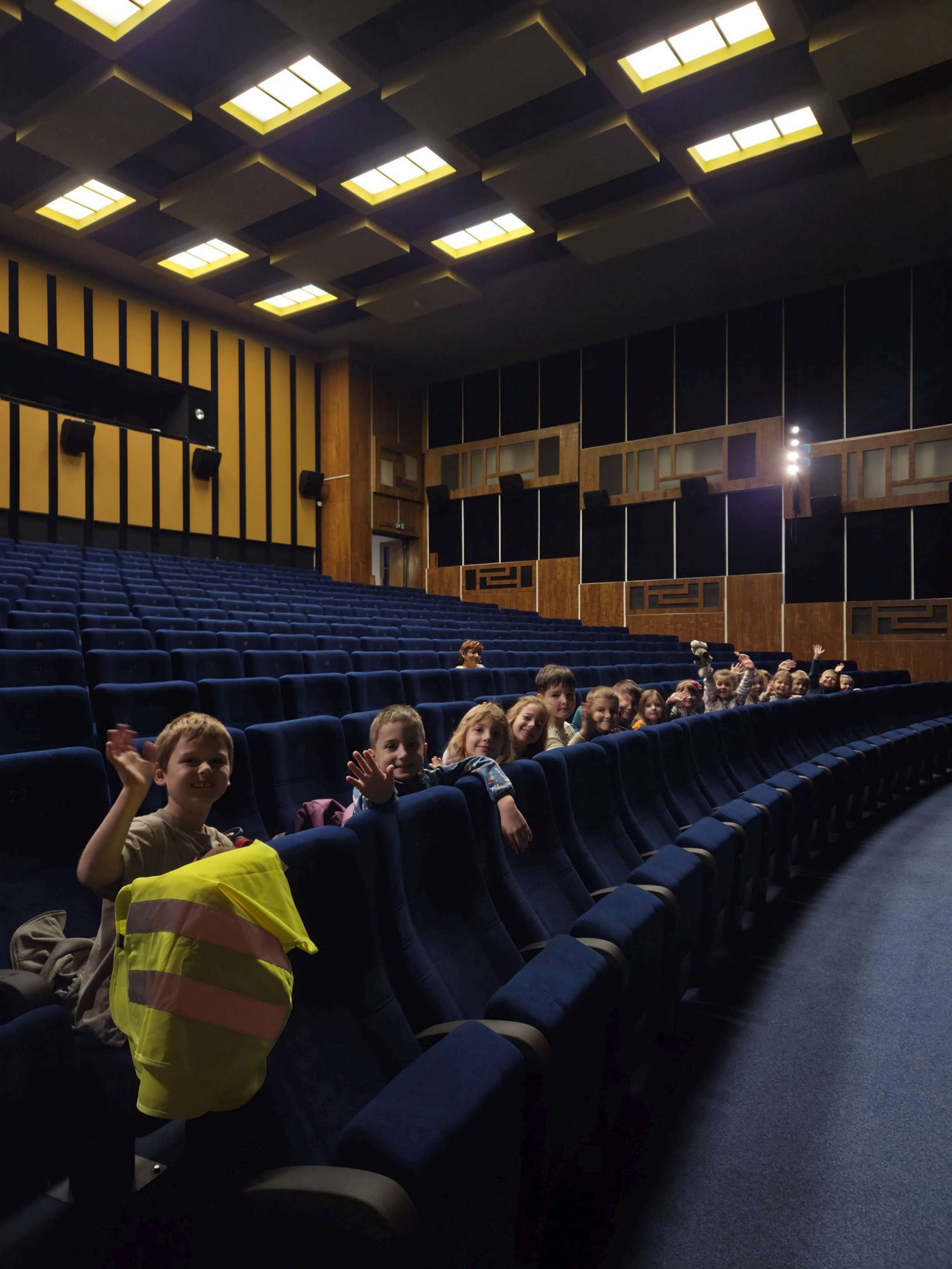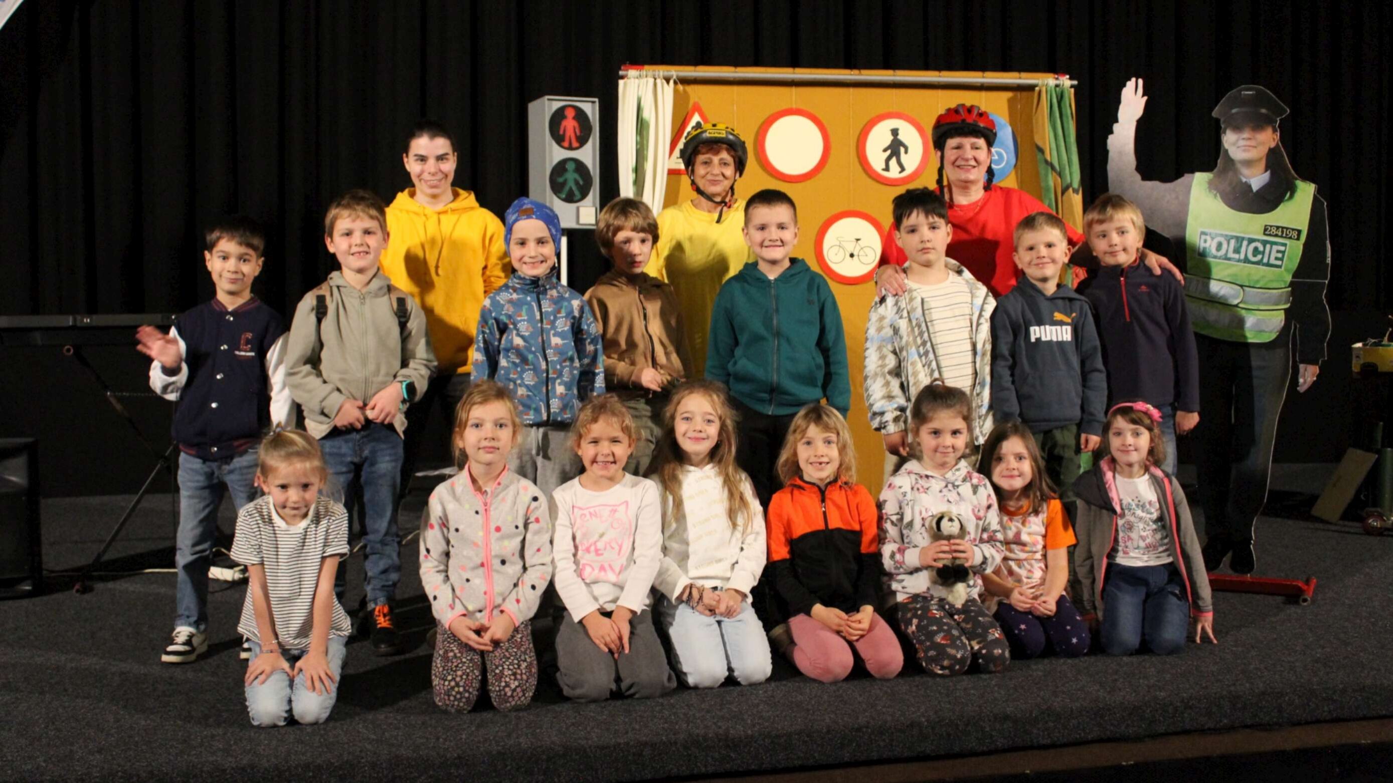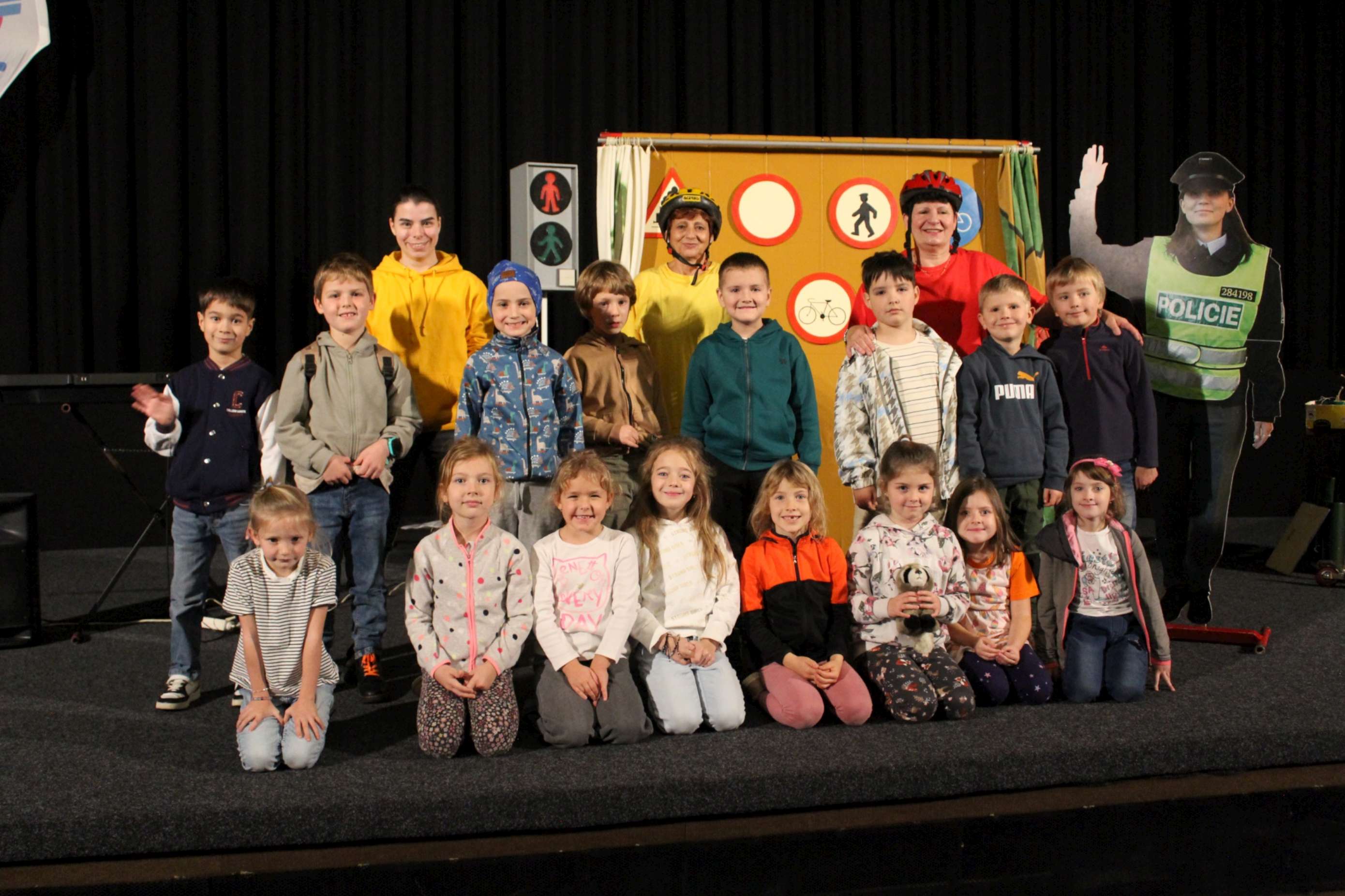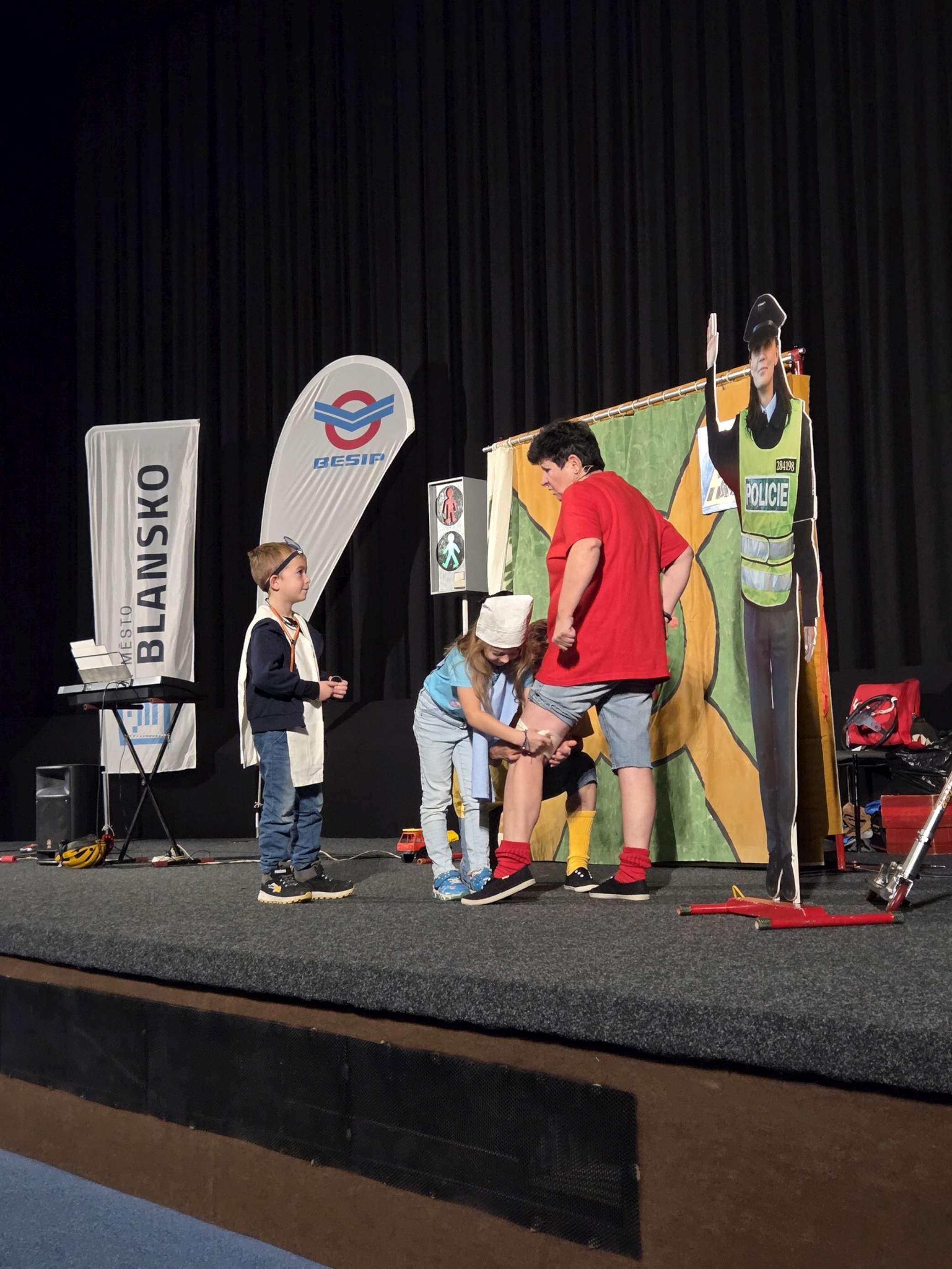 Ve čtvrtek 30. 10. 2025 se žáci prvních ročníků v blanenském kině zúčastnili programu „S tetinama na zelenou“. Děti se hravou formou dozvěděly, jak se chovat v silničním provozu, jak ošetřit zraněné koleno a zopakovaly si také názvy dopravních značek. Někteří se podívali i na podium a vyzkoušeli si zde například roli lékaře.