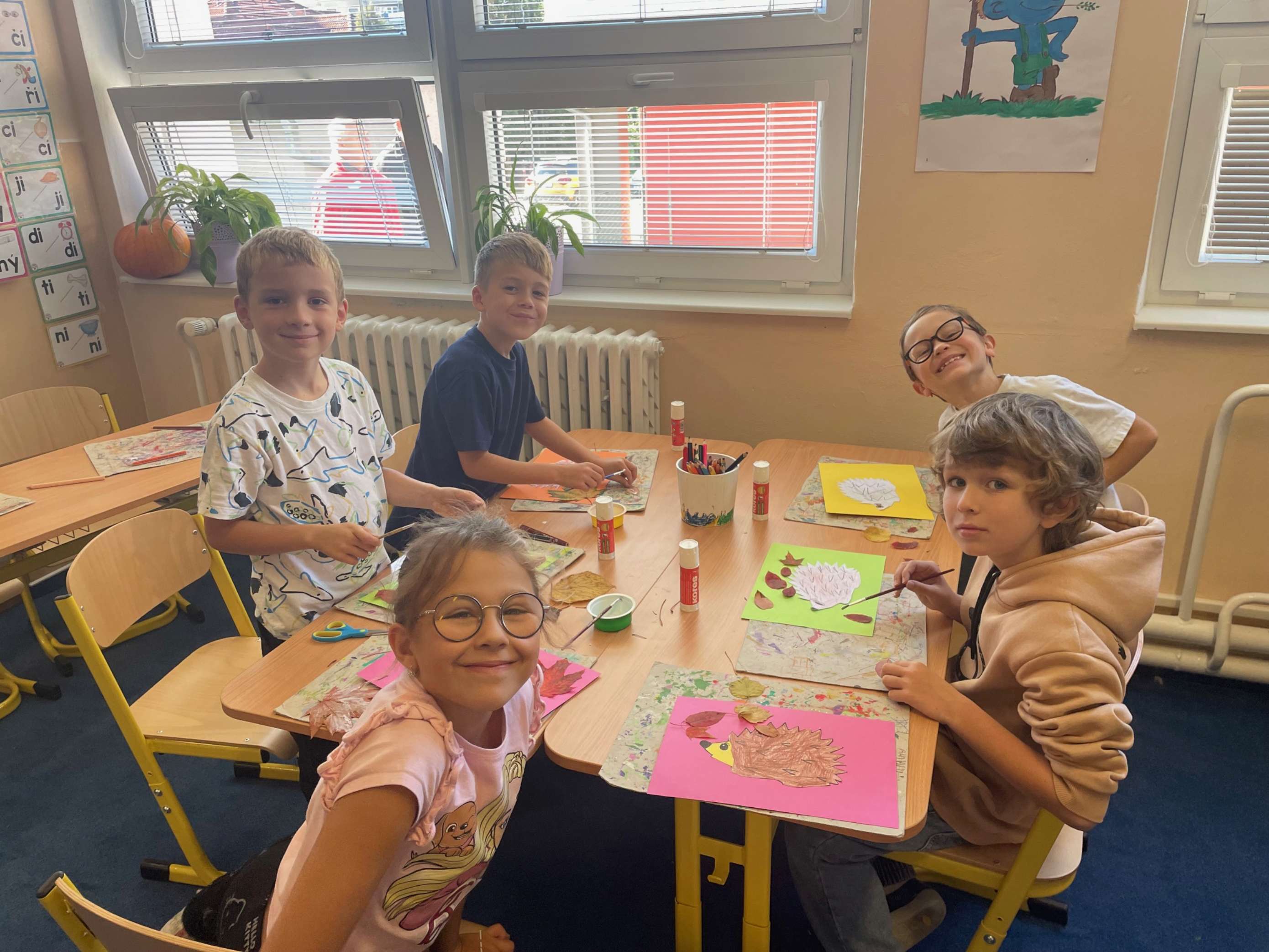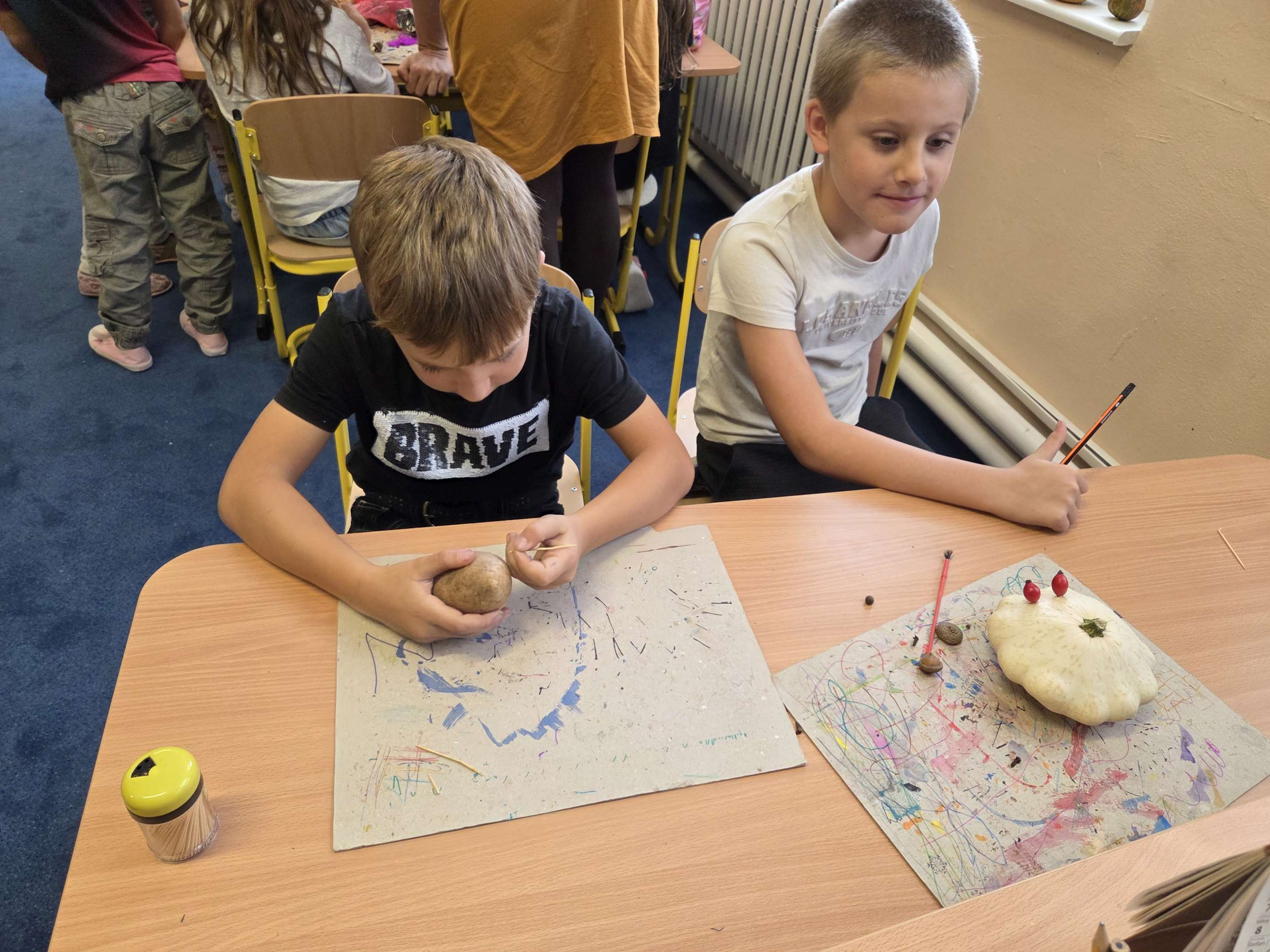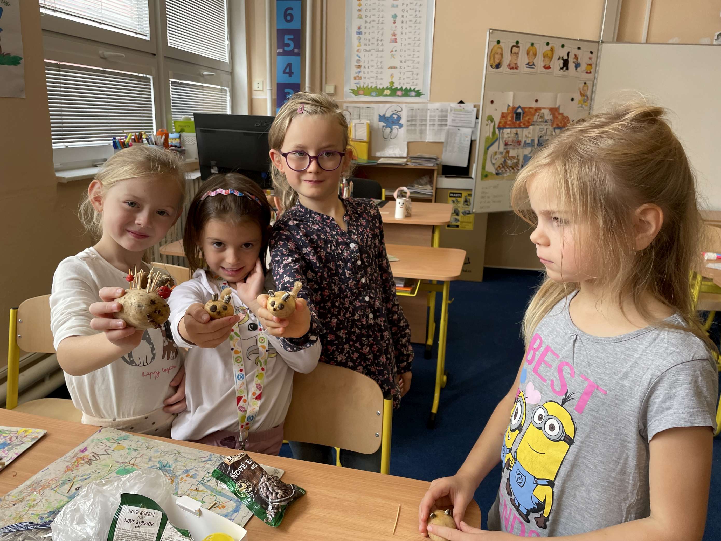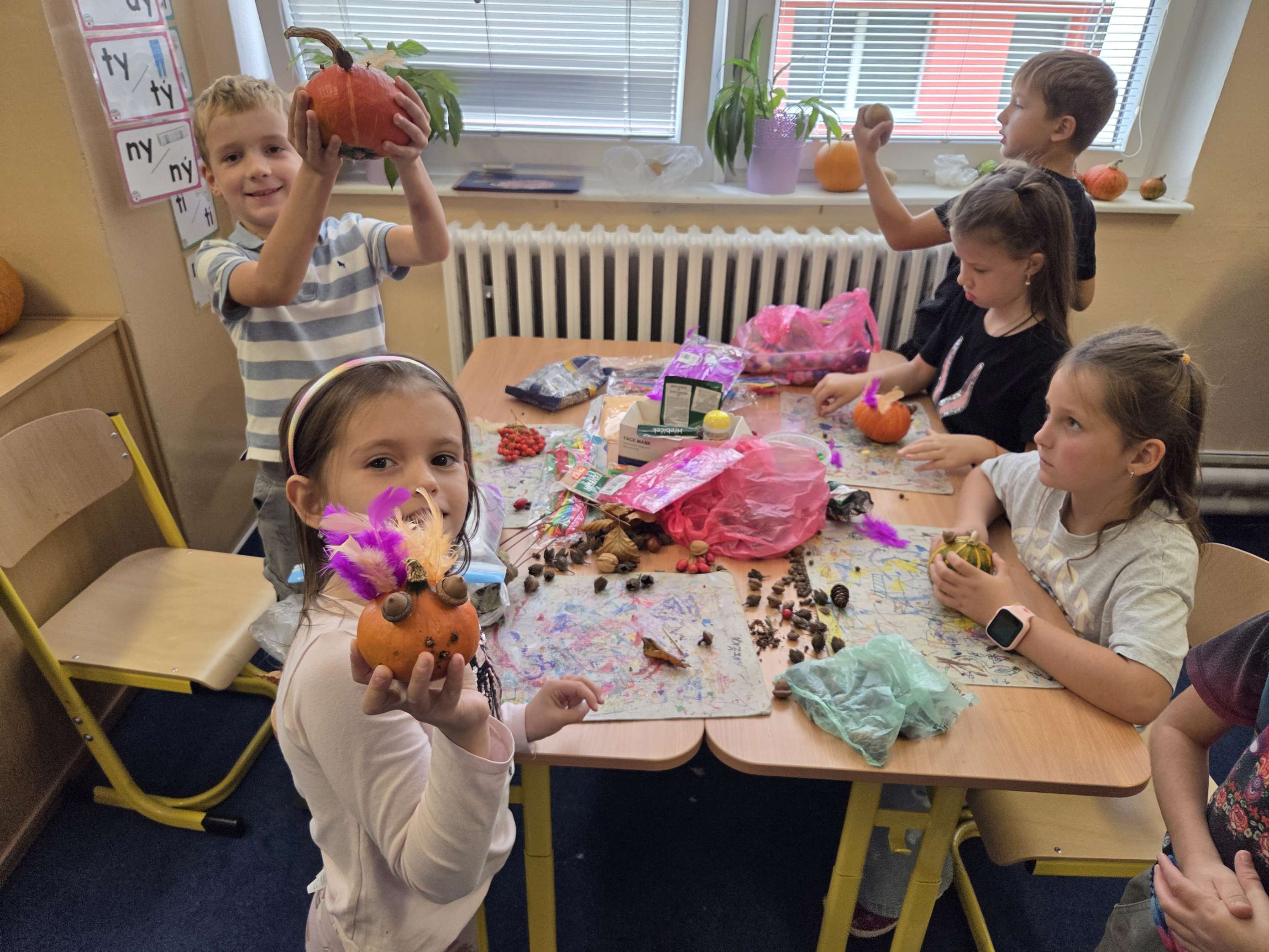 Na začátku měsíce jsme vyráběli podzimní dekorace z přírodnin – listů, kaštanů a žaludů. Děti si vytvořily své vlastní skřítky „Podzimníčky“ z dýní a brambor, které pak vystavily v naší družině.