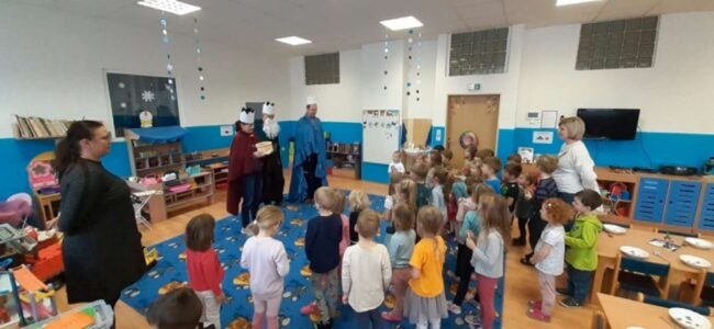 Děti se dozvěděly o příběhu tří králů, tři krále výtvarně ztvárnily a nakonec tři králové naši školku navštívili.