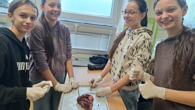 Žáci osmých tříd měli příležitost si v přírodopisu prohlédnout stavbu 4dílného savčího srdce ( z prasete – sus scrofa domesticus). K dispozici měli čtyři srdce, a proto pracovali ve skupinkách. Prozkoumali srdeční svalovinu, síně, komory, chlopně a věnčité tepny.