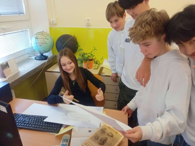 Ve třídě 7. A se znovu odehrála netradiční hodina výtvarné výchovy. Žákyně Bety, která už dříve ukázala svůj talent pro výuku, se tentokrát rozhodla své spolužáky zasvětit do tajů stínování.