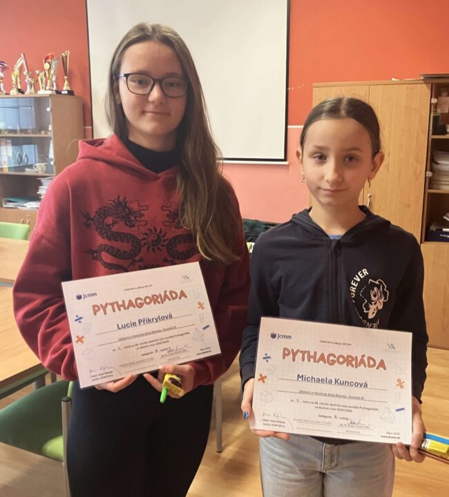 Minulý týden proběhlo školní kolo Pythagoriády. Ze všech zúčastněných se podařilo do okresního kola postoupit Michaele Kuncové z 6. B a Lucii Přikrylové z 9. A.