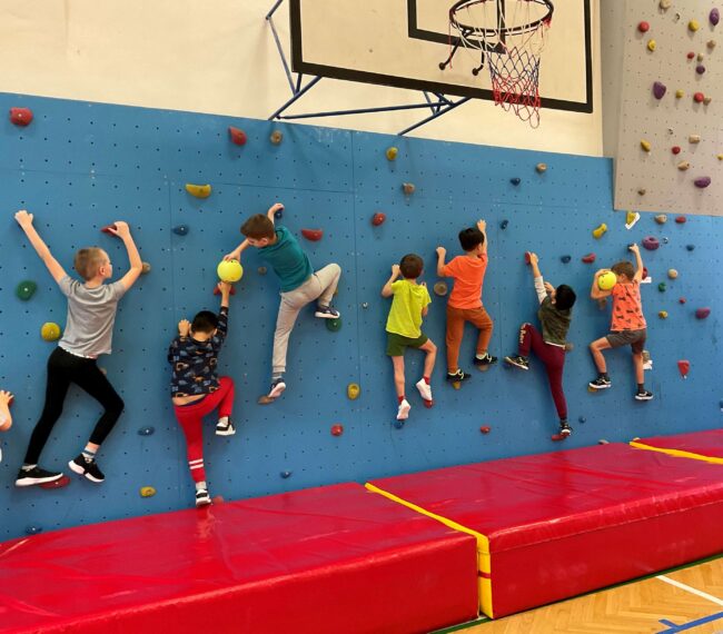Děti si vyzkoušely bouldering – lezení na nízké stěně a pak se pustily (jištěny lanem) do lezení až ke stropu tělocvičny.