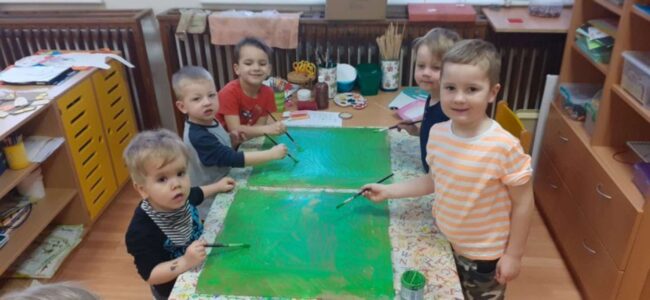 Děti hledaly ve třídě fialové předměty, zahrály si hudebně pohybovou hru „Uvíjíme věneček“ a tvořily také fialové květiny – šeřík a levanduli.