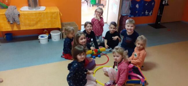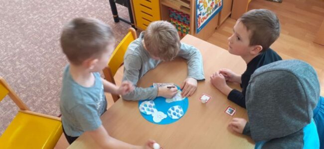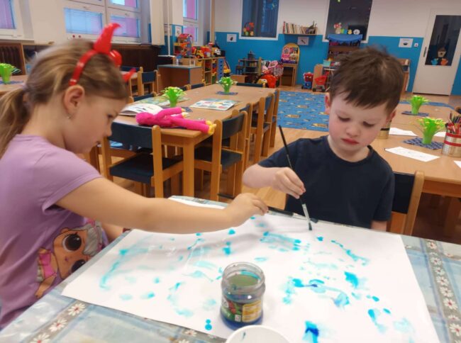 Také ve třídě Sluníček děti zhlédly příběh o koloběhu vody a povídaly si o důležitosti vody. Malé děti vyrobily zapouštěním modré barvy mraky, starší děti vystřihovaly kapky a předškolní děti vyrobily obrázek o koloběhu vody.