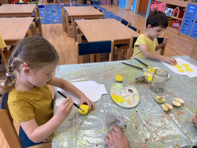 Děti dělaly otisky jablíček na papírovou kompotovou sklenici.
