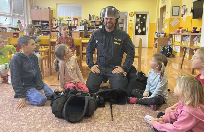 Pan Vašák nám povídal o práci policisty a proč je důležitá. Děti měly možnost si prohlédnout a vyzkoušet, co všechno potřebuje pro svoji práci pořádkový policista.
